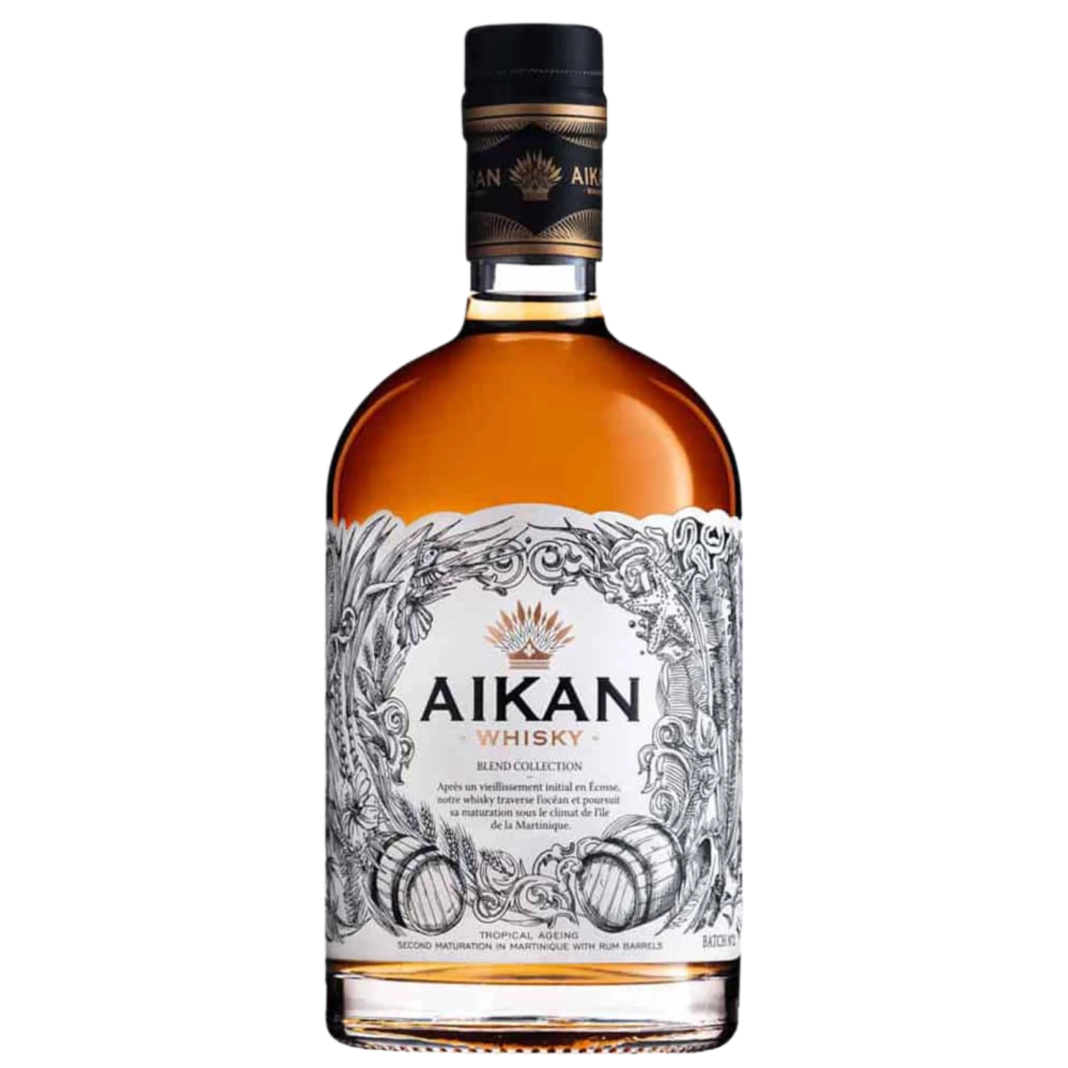 Der interessante Aikan Blend Collection Batch No.3 Whisky stammt von einer Firma, die gern Experimente wagt und mit ihren innovativen Qualitätsprodukten ein neues Zeitalter einläutet. Das Besondere an dieser Spirituose ist, dass der Whisky nach seiner Destillation drei Jahre lang regulär in seiner Heimat bei kontinentalem Klima in Eichenfässern reifte. Für seine Nachlagerung transportierte man den Aikan Blend Collection Batch No.3 Whisky in karibische Gefilde. Auf der französischen Antilleninsel Martinique lagerte er zwei weitere Jahre in einem ehemaligen Rumfass nach und wurde dabei vom tropischen Klima voller Feuchtigkeit und Hitze beeinflusst. Dort setzte man den Single Malt auch einem höheren angels’ share von 10 % (statt 2 % in Europa) aus. Gleichzeitig hatte das Finishing in Rumfässern in der Karibik zur Folge, dass der Whisky etwa viermal schneller heranreifte und ein hochkonzentriertes Aroma zu bieten hat.