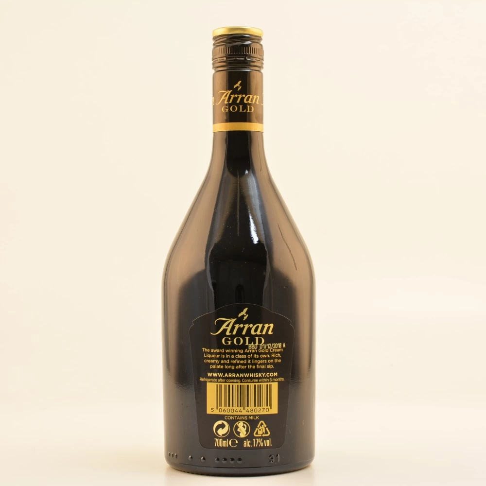 Der charmante Arran Gold Cream Likör auf Whisky-Basis muss sich hinter seinen berühmten Brüdern nicht verstecken. Die Grundlage für den Likör mit herrlich niedrigem Alkoholgehalt ist hochwertiger Arran Single Malt Whisky von der Isle of Arran. Der Scotch wurde mit Milch bzw. Sahne verfeinert und ist damit ein unwiderstehlicher Cream Liqueur. Die schwarze Flasche mit den goldenen Akzenten macht auf Anhieb deutlich, dass dies kein liebloses Massenprodukt ist, sondern ins Premium-Segment gehört. Der schmackhafte Arran Gold Cream Likör wurde bei den vom Whisky Magazine organisierten „World Whiskies Awards 2007“ zum weltbesten Whiskylikör (World’s Best Whisky Liqueur) gekürt. Bei der „International Wine & Spirit Competition 2005“ wurde er „Best in Class“ und gewann Silber.