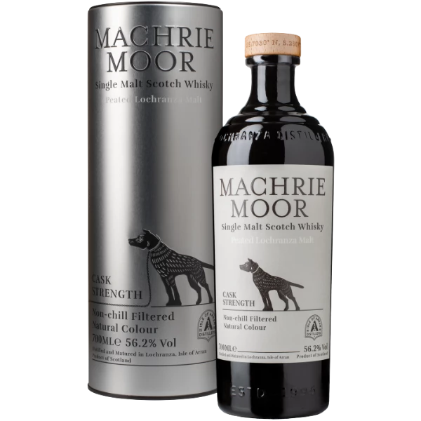 Der spannende Arran Malt Machrie Moor Cask Strength Whisky aus Schottland hat reichlich Respekt verdient. Inzwischen ist schon die vierte Edition der Sonderabfüllung aus der Serie Machrie Moor der Arran Distillery erhältlich. Sie benennt das Moor, aus dem man den Torf für das Darren des Gerstenmalzes bezieht. Der hochwertige, authentische Inselwhisky von den Hebriden schafft es auf deutlich mehr als 50 % vol. Trinkstärke und ist daher etwas für Kenner und Fans. Er strotzt nur so vor Selbstbewusstsein und Persönlichkeit – und das greift die markante Produktpräsentation in Schwarz und Silber mit Hundelogo gekonnt auf.