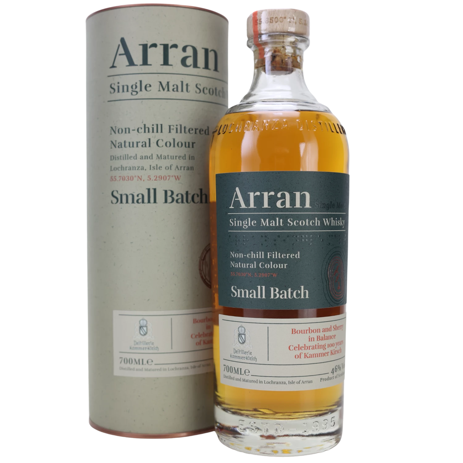 Der edle Arran Malt Small Batch Exclusive 100th Anniversary Whisky mag keine Einzelfassabfüllung sein, doch in gewisser Weise lässt er sich mit ebenfalls erhältlichem Single Cask Whisky aus Arran vergleichen. So erfolgte die Destillation für diese besondere Charge in geringen Mengen. Erhältlich ist hiermit anspruchsvoller und authentischer Inselwhisky, denn die Arran Distillery ist seit 1995 auf der gleichnamigen Hebrideninsel aktiv. Der Arran Malt Small Batch Exclusive 100th Anniversary Whisky überzeugt also mit einer gewissen maritimen Prägung, die ihn von der Masse abhebt. Kennzeichnend für die Sonderedition ist außerdem, dass die Lagerung von mehreren Jahren sowohl in amerikanischen Bourbonfässern als auch in spanischen Oloroso-Sherryfässern stattfand. 2015 destilliert und 2023 zum 100. Jubiläum von Kirsch Import abgefüllt, hinterlässt dieser Scotch einen bleibenden Eindruck. Die Limited Edition mit Sammelwert richtet sich insbesondere an Kenner und eignet sich darüber hinaus als Geschenkidee.