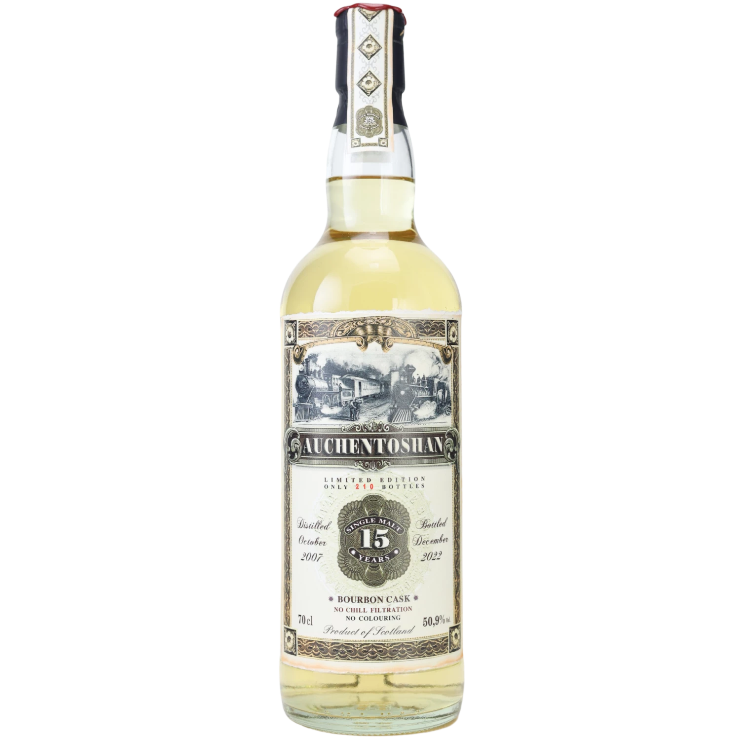 Der vielversprechende Auchentoshan 15 Jahre Single Malt Whisky kann sich mühelos mit der etablierten Konkurrenz aus anderen Regionen messen. 2007 aus Gerstenmalz destilliert, zollt er der renommierten und alteingesessenen Auchentoshan Distillery Tribut. Sie ließ ihn nach der Destillation in einem Bourbonfass aus amerikanischer Weißeiche 15 Jahre lang lagern. Der schottische Whisky aus den Lowlands wurde 2022 als Teil der Sonderserie Old Train Line in insgesamt nur 210 Flaschen abgefüllt. Dabei begeistert er nicht nur als limitierter Single Cask Whisky, sondern auch als Cask Strength Whisky in Fassstärke. Der nicht allzu hochprozentige, aber ausgesprochen hochwertige Premium-Whisky ist als Einzelfassabfüllung vor allem für Kenner und Sammler gedacht. Er kommt ohne Farbstoffe und ohne Kühlfiltration zum Kunden und bietet herrlich authentischen Genuss.
