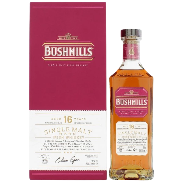 Der Bushmills 16 Jahre hat einen mittelmäßigen Alkoholgehalt von 40 % vol. Das macht in weder zu intensiv für einen puren Genuss, noch zu sanft für das Mixen mit Softdrinks. Da er eine so hohe Sherry-Note und so gut wie keinen Torfgehalt hat, sollte man ihn nicht mit allzu süßen Getränken mischen. Sein fruchtig-blumiges Aroma und sein harmonischer Geschmack bleiben auch dann erhalten, wenn man ihn mit Eiswürfeln und etwas Wasser verdünnt. Der Originalabfüllung des Bushmills 16 Jahre werden Farbstoffe zugesetzt und der Whisky wird kalt gefiltert, was an seiner hohen Qualität jedoch nichts ändert. In seiner klassischen, langen Flasche kommt seine rötliche-karamellige Farbe gut zur Geltung.