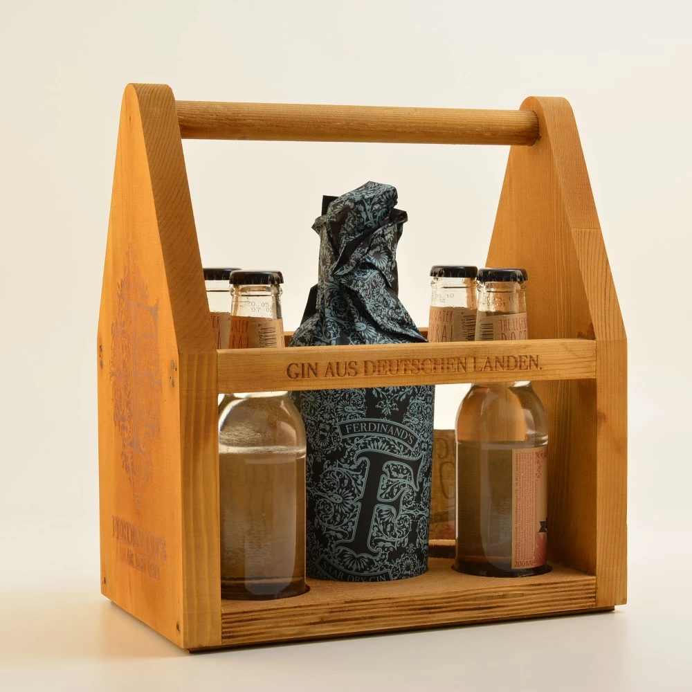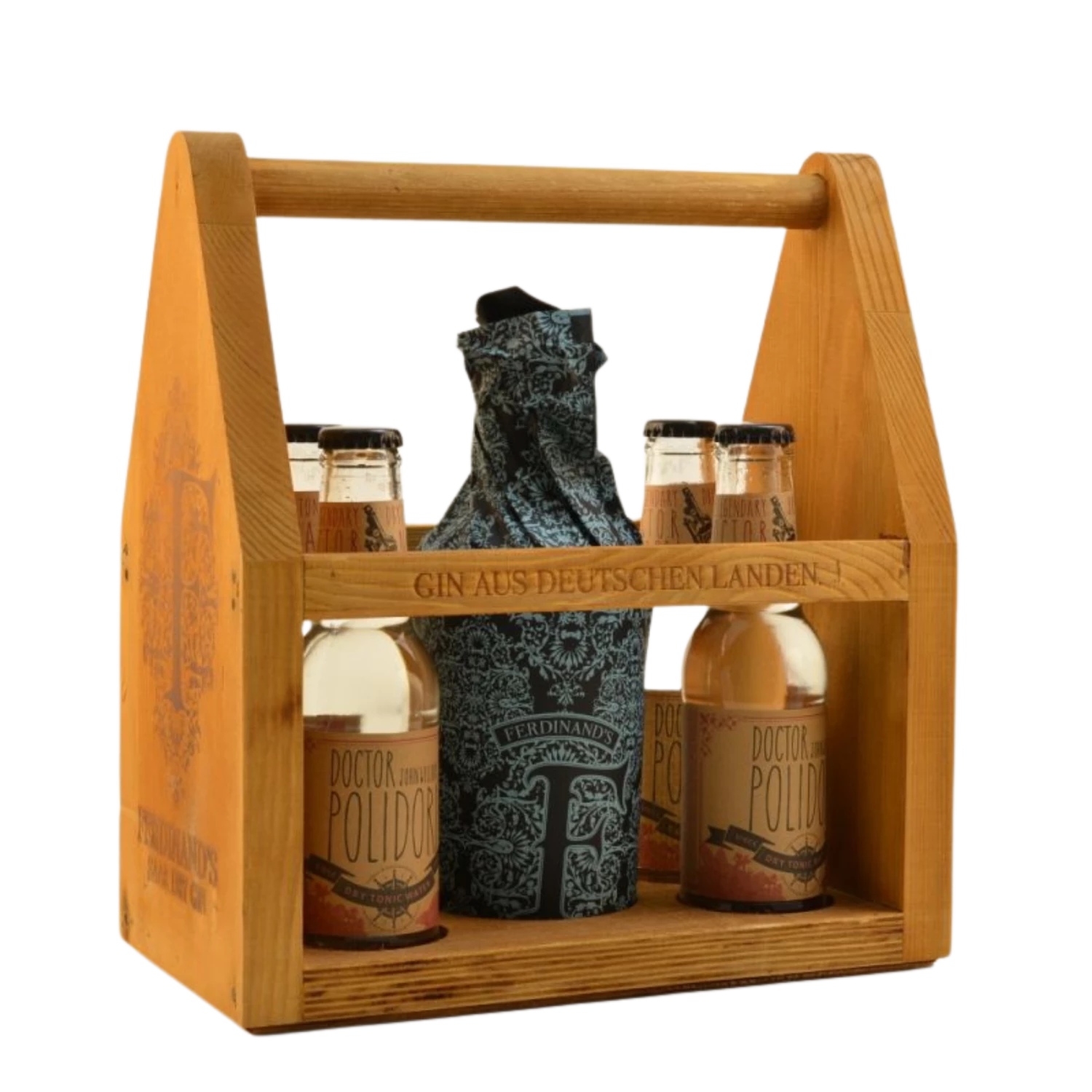Was wäre ein Gin ohne Tonic? Wohl nur halb so toll, denn viele von uns mixen beides miteinander für einen der beliebtesten Longdrinks der Welt, den Gin & Tonic. Je nachdem, wie der Gin schmeckt und welche Art von Tonic Water man wählt, ergeben sich unendliche Kombinationen. Manch ein Hersteller von Gin konzipiert sein eigenes Tonic-Wasser, um eine schier perfekte Paarung zu ermöglichen. Die Ferdinand’s Werkzeugkiste des deutschen Betriebs liefert ein solches Highlight. Zu einer Flasche Ferdinand’s Saar Dry Gin gesellen sich vier Flaschen mit Doctor Polidori Dry Tonic Water. Geliefert wird das Geschenkset in der coolen, griffigen Verpackung aus Holz, die entfernt an einen Werkzeugkasten erinnert.