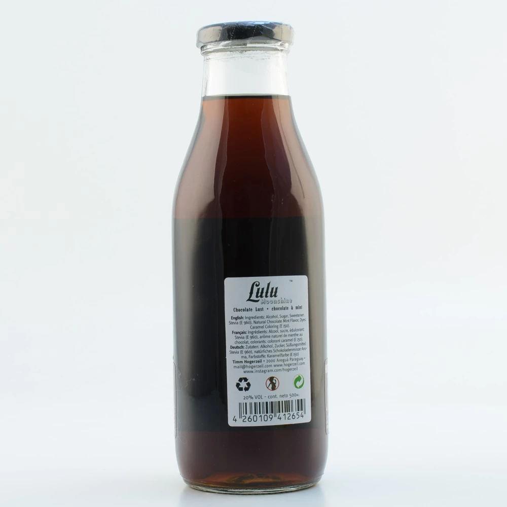 Der finessereiche Lulu Moonshine Chocolate Lust ist ein „ready to drink“ Cocktail, bei dem alle wichtigen Zutaten schon miteinander vermischt wurden und man nur noch entspannt genießen muss. Es handelt sich um einen Drink auf der Basis von feinem Rum. Jener wiederum basiert auf Zuckerrohr aus dem mittelamerikanischen Land Paraguay, das nicht mit Chemie in Berührung kam. Den Rum hat man mit Schokolade und Minze aromatisiert. Der schmackhafte Lulu Moonshine Chocolate Lust in der handlichen Flasche ist zwar modern, doch er spielt auf die Vergangenheit an. So zollt er den einst illegal in Amerika gebrannten Spirituosen während der Prohibition Tribut, die meist nachts bei Mondschein in der Badewanne destilliert und in Einmachgläser abgefüllt wurden.