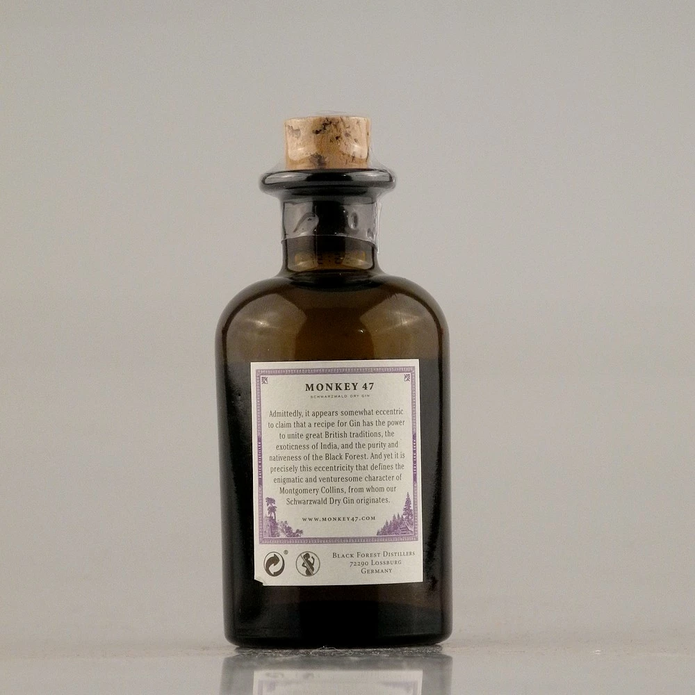Monkey 47 Dry Gin in der MINI Ausgabe. Ja, auch die Deutschen verstehen sich auf die Ginherstellung. Der untrügliche Beweis hierfür ist der Monkey 47 Dry Gin, der im Herzen des Schwarzwalds in Baden-Württemberg produziert wird. Mit Fokus auf regionaltypischen Zutaten, traditionellen Methoden und Liebe zum Detail entsteht im Südwesten Deutschlands ein Gin der Extraklasse, der dem klassischen London Dry Gin so einiges entgegensetzt und von Premium-Qualität ist.