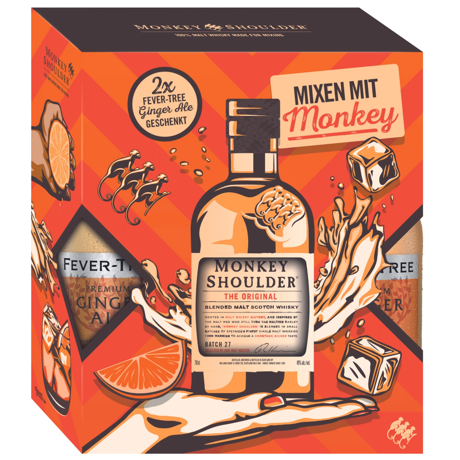 Das Set enthält 1x Monkey Shoulder Blended Malt Whisky 40% 0,2l & 2x Fever Tree Ginger Ale 0,2l