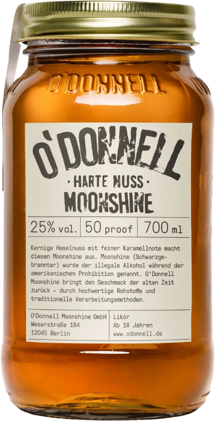 Was hat der Mondschein mit Spirituosen zu tun? Während der Prohibition in den USA, die gegen Anfang des 20. Jahrhunderts den Import und die Herstellung von sowie den Handel mit Alkohol verbot, ließen sich die Amerikaner etwas einfallen: Viele von ihnen begannen mit dem illegalen Brennen von Spirituosen zu Hause. Die Nacht-und-Nebel-Aktionen fanden meist nachts bei Mondschein statt, und destilliert wurde zum Teil in der Badewanne. Die Resultate musste man dann verstecken und griff daher u. a. zu Einmachgläsern, die so gar nicht an Alkoholisches denken lassen. An diese abenteuerliche Zeit erinnert der O’Donnell Original Moonshine „Harte Nuss“ sowohl vom Namen her als auch mit seiner innovativen Produktpräsentation.