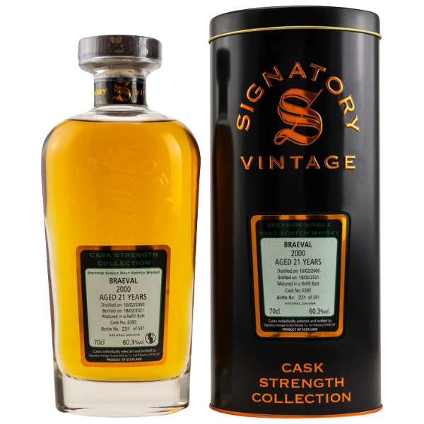 Der exklusive Signatory Cask Strength Collection Braeval 2000/2021 Single Cask Whisky aus Schottland stammt von einem bekannten unabhängigen Abfüller und präsentiert sich als edle Einzelfassabfüllung. Der Scotch ist Teil einer Produktlinie, die sich dem Whisky in Fassstärke widmet und daher hochprozentigen sowie hochwertigen Genuss mit authentischem Charakter bietet. Der Signatory Cask Strength Collection Braeval 2000/2021 Single Cask Whisky aus der Speyside erhielt nach seiner Destillation die Chance, rund zwei Jahrzehnten zu reifen. Seine 21 Jahre dauernde Lagerung fand in einem ehemaligen Sherryfass (refill butt) statt. Insgesamt gibt es von der Limited Edition nicht einmal 600 Flaschen. Die limitierte Sonderedition mit hohem Alkoholgehalt hat Respekt verdient.