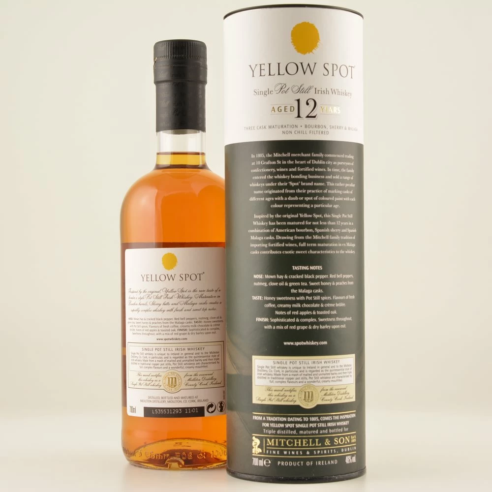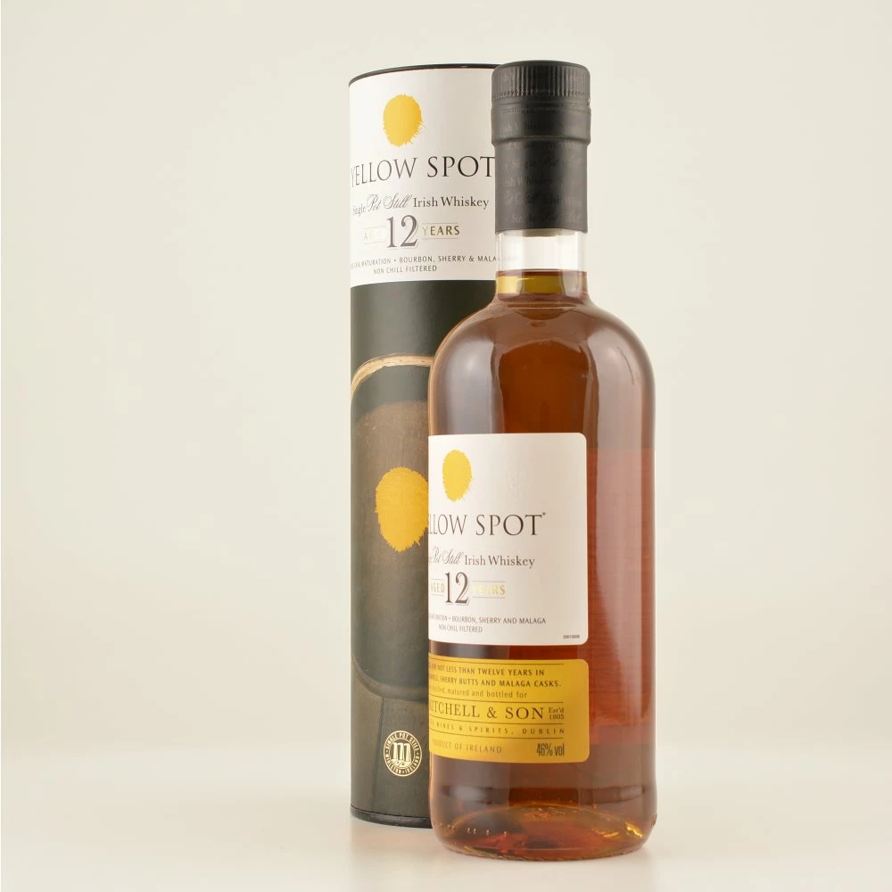 Der Yellow Spot 12 Jahre Whiskey aus Irland ist nicht einer der vielen Blends, die man aus diesem Land entdecken kann, sondern eine Besonderheit. Es handelt sich nämlich um einen Single Pot Still Whiskey. Er wird nicht wie die Mehrheit auf kontinuierliche Weise im column still (in einer säulenförmigen Brennkolonne), sondern auf diskontinuierliche, traditionelle Art im pot still (Kupferbrennkessel) destilliert. Seit Mitte der 20er-Jahre gibt es den exklusiven Yellow Spot 12 Jahre Whiskey von der Firma Mitchell & Son zu kaufen. Gebrannt wird er – wie könnte es bei Irish Whiskey anders sein – in der Midleton Distillery, die u. a. auch für Jameson Whiskey verantwortlich ist. Nach dem Brennvorgang ruht der Yellow Spot Whiskey bis zu 12 Jahre in drei Fassarten, in denen zuvor Bourbon aus Amerika sowie Sherry und Málaga aus Spanien geruht hatten.